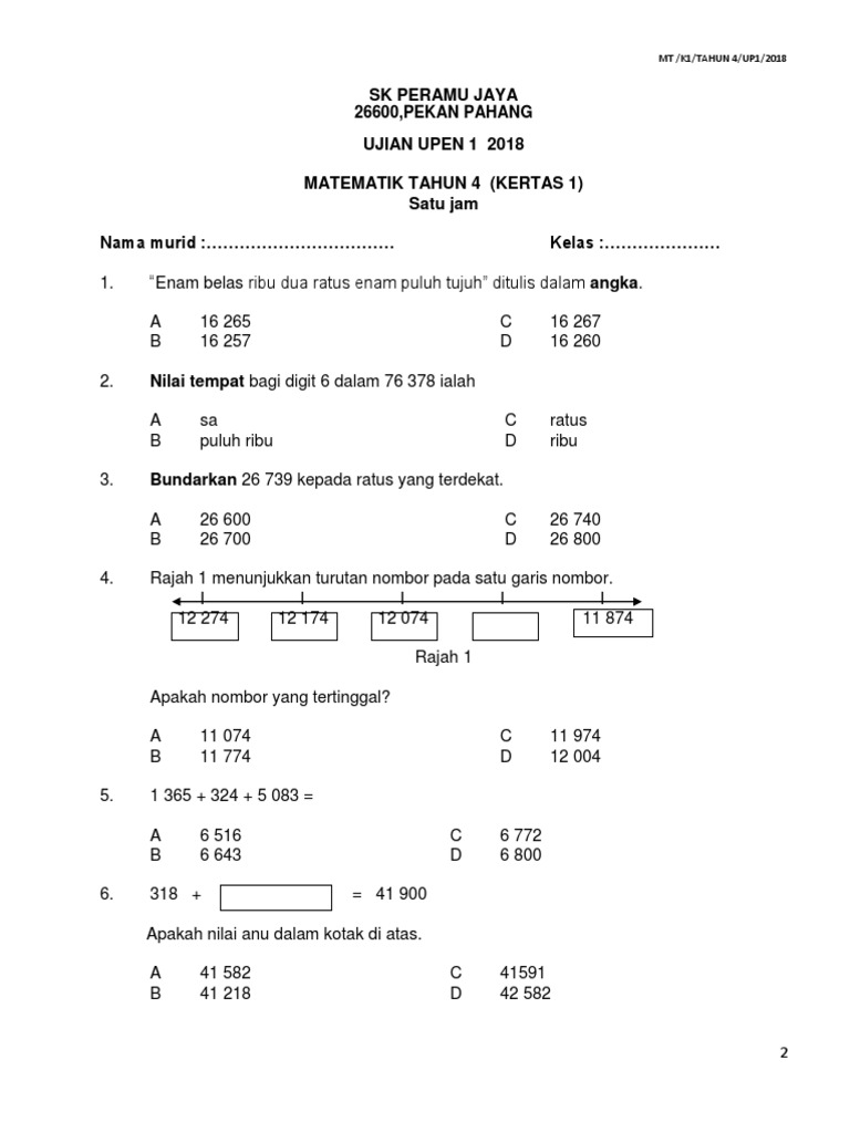 Ujian Pertengahan Tahun Kertas 1 Matematik Tahun 4 Kertas Tulisan Latihan